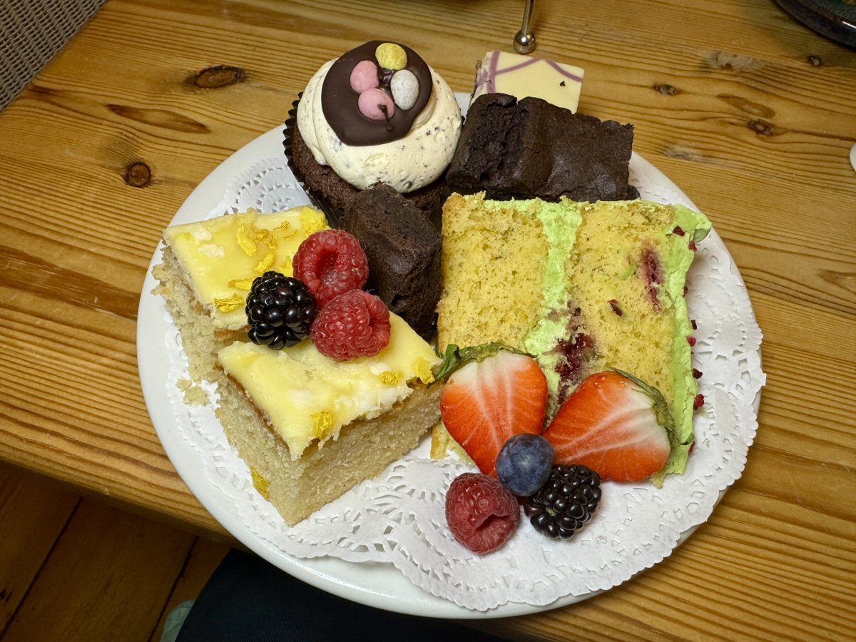 The serving team kept a close eye on how we were progressing, and stepped in to offer more pots of Tea at this point, which we happily accepted. Perched on the uppermost tier of the Afternoon Tea stand were an assortment of cakes and fresh Blueberries, Blackberries, Raspberries and Strawberries; surely this counts as one of your 5-a-day? Well put it this way; in my mind, I was indulging in a guilt-free feast – not that I ever need an excuse!