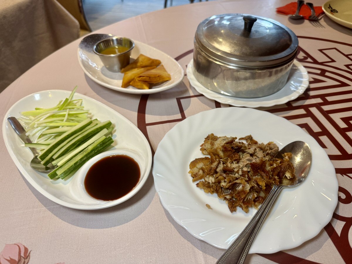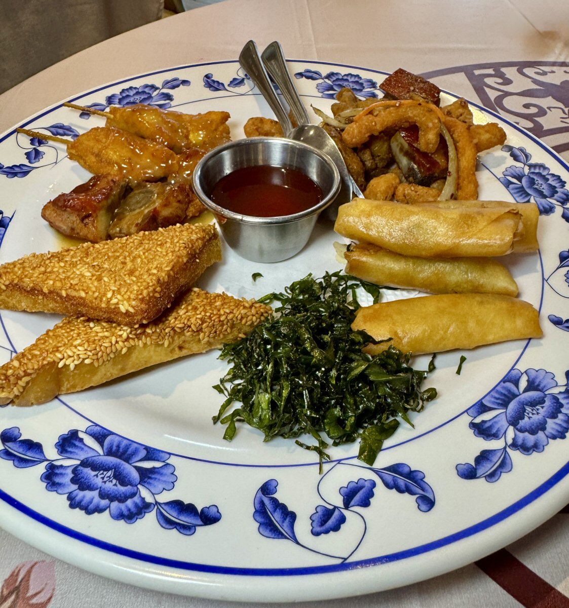 A helpful suggestion was to have the Mixed Starter Platter first (containing meat), as that gives you a taster of everything and then you can always order more of items that particularly tickle your taste buds. I do like it when servers give you a ‘heads up’. Whilst we waited for the platter to arrive, I had a good look around at the ‘distinctive’ décor. Don’t ask me what it is, but don’t you think that Chinese folks have a knack of pulling off clashing décor styles in a way that no-one else can? Up-turned parasols and lanterns were suspended from the ceiling, amongst the recessed spotlights, and 3D stars/icicles were hanging beneath fairy-light strewn garlands of faux foliage. The most bonkers wall paper you could imagine adorned one wall: it was red-brick wall punctuated with trailing Ivy, and was strangely at home in this fabulous space. Random it most certainly was, and yet it worked in a weird sort of way; as I said, don’t ask me how, but this Oriental team pulled it off.