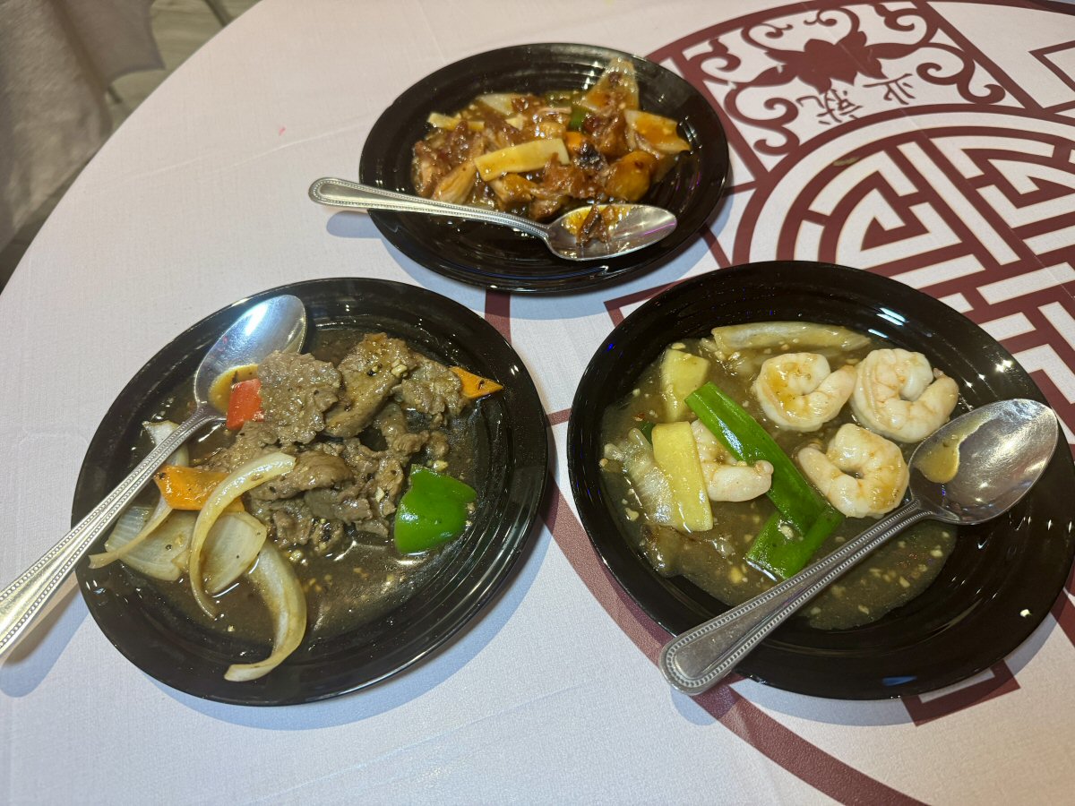 For our second round of mains we opted for Beef in Black Pepper Sauce, Szechuan Duck, and King Prawns with Ginger and Spring onion…and some more steamed rice. If we’d thought the Chicken in Yellow Bean was delicious, the Szechuan Duck blew it out of the water! This was an utterly amazing dish. The Duck Breast had a superb crispness to its skin and the meat was gamey and rich, partnering the punchy Szechuan Peppers fantastically well. Honestly, this was one of those dishes that you don’t forget easily. The flavoursome meat and sauce had been accompanied by Bamboo Shoots, White Onion and Green Peppers, all of which were fresh and crunchy against the smooth sauce and tender Duck. This was the star of the show for us, hands-down.