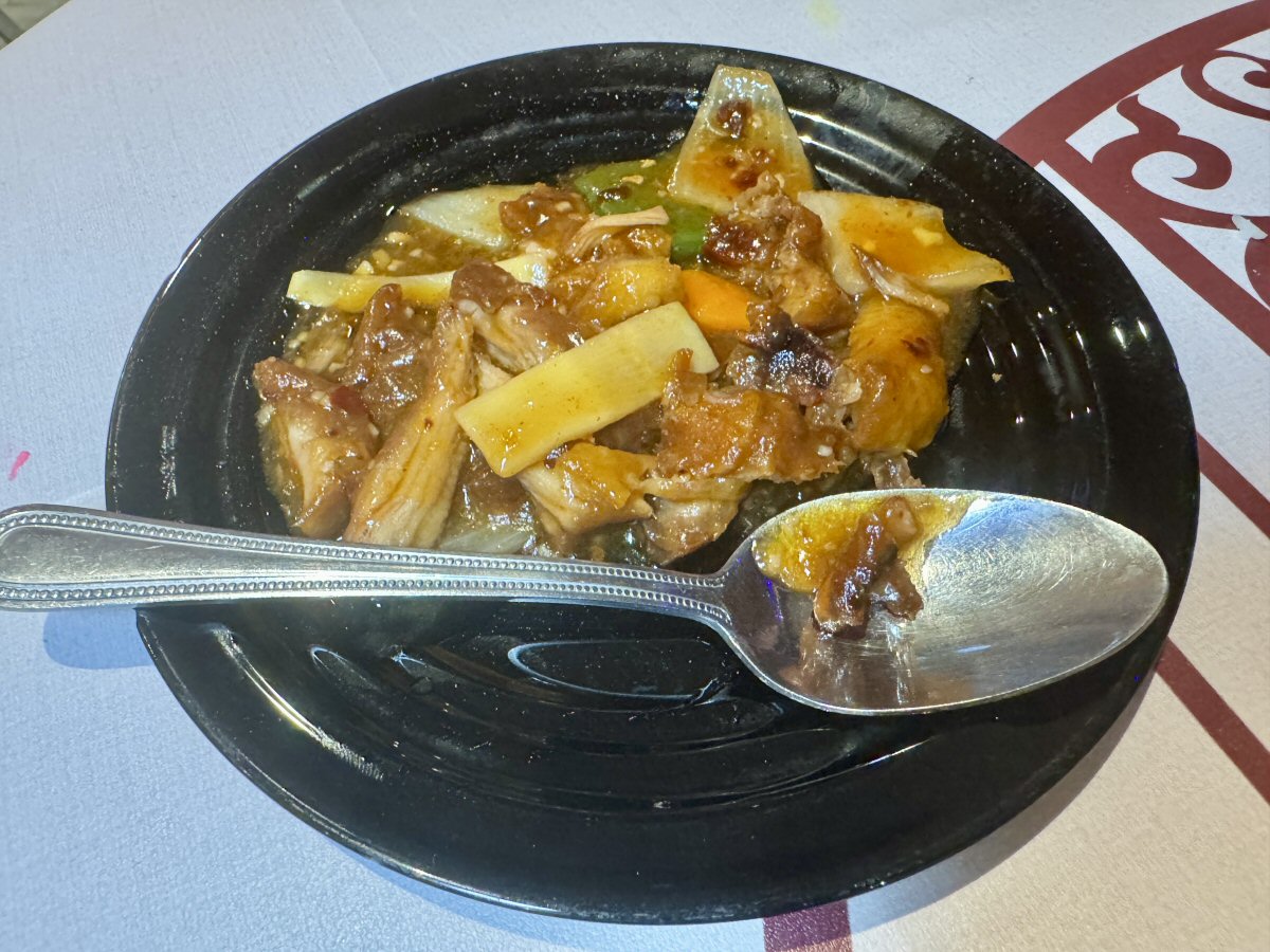 Our first batch of main course dishes were Crispy Shredded Chilli Beef (The Man Birds’ favourite), Chicken in Hoi Sin Yellow Bean Sauce for me, and a portion of Steamed Rice. Keen to avoid unnecessary food waste, Chef has got the portion sizes down to a fine art: you have enough to serve two and get a good feel for the dish, but not so much that any gets left. The Crispy Chilli Beef was exactly as stated: crispy and with a definite Chilli heat to it; His Nibs was very happy with this dish, saying it was as nice as any he’d had elsewhere.