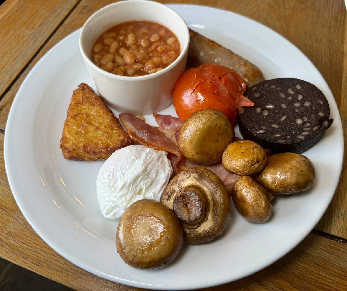Breakfast is included in the room rate, and is served in the main restaurant area so, after a marvellous nights’ kip, that was where we headed. As soon as we sat down, we were asked if we’d like tea or coffee and bidden to help ourselves to fresh juices, cereals, yoghurt and fruits. On the tables were menus for the breakfast dishes and His Nibs immediately chose the Full English (with your choice of eggs) and I had the Eggs Royale.