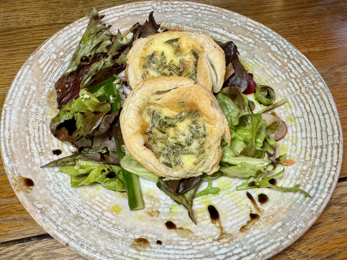For starters we chose the Greek Salad and Feta Cheese, and Caramelised Red Onion and Brie Tartlets, served with Mixed Leaves, followed by Pork Belly and Cider-battered Fish and Chips (His Nibs’ first choice had been the Chicken and Bacon Pie, but this was still cooking!). Table water had been offered upon our arrival and I had a glass of Shiraz and The Man had a pint of Estrella, so we sat, sipped and yapped (say that quickly!) as we awaited our first course.