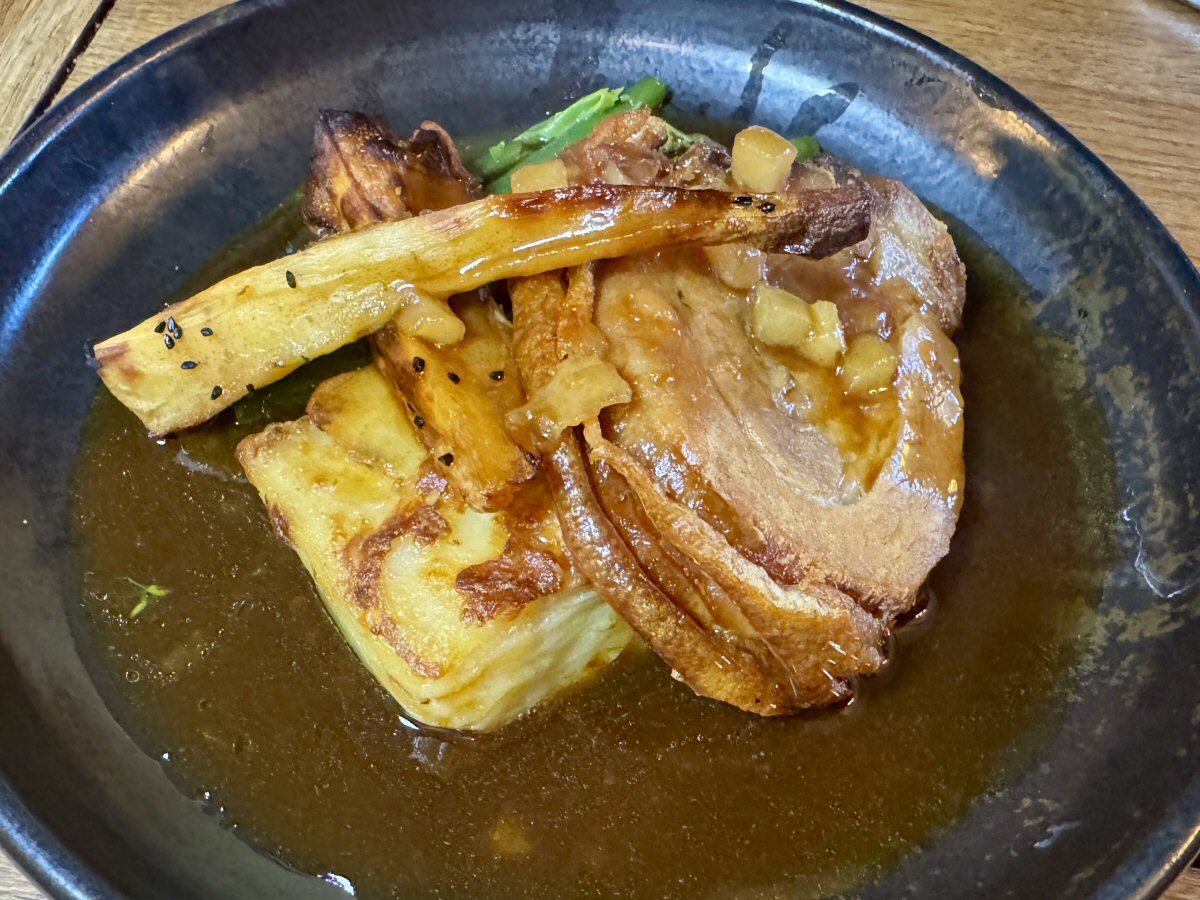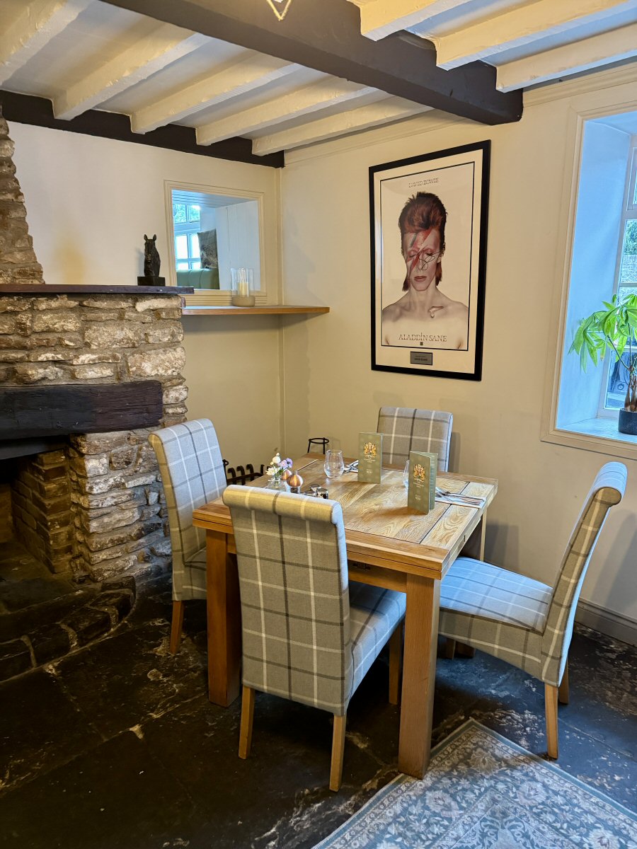 We were shown over to our table in one of the cosy sections, the focal point of which was the huge stone fireplace. There’s a perception that Rosetted places can be a bit ‘stuffy’ not The Congresbury Arms! Huge prints of David Bowie in his Aladdin Sane era and a fantastically subversive one of an ‘Aladdin’d’ Queen Elizabeth II were mounted prominently on the walls, clearly seen from all angles in the space. Very cleverly, this modernity was tempered by more traditional elements such as the pastel green Banquette and tonal checked fabric on the high-back chairs that were paired with the solid wood tables. Small arrangements of fresh flowers and good quality single-use napkins were set on the table, partnered with gleaming cutlery and glassware.