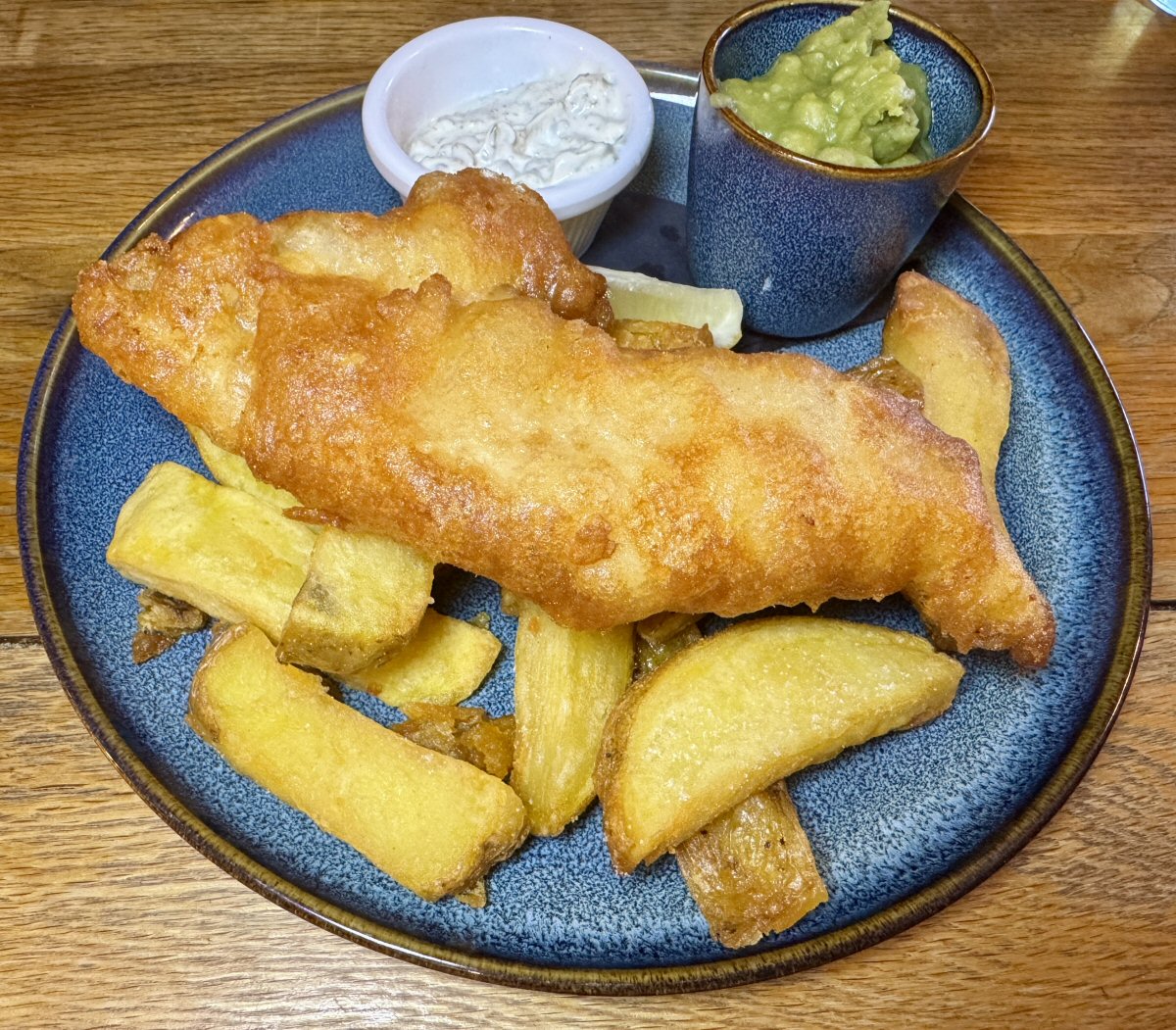 Opposite me, His Nibs was answering the challenge of ‘who has got the loudest crunching dish’ call-to-arms! Honestly, the batter on his fish was ridiculously crisp…and possibly the best batter in the universe. Beyond crunchy, and with no trace or taste of grease to sully its cider-pimped marvellousness, it paired superbly with the sweet, moist fish whose delightfully meaty texture flaked, rather than fell apart, when cut into. The chunky Chips were equally glorious: thick, golden slices of spud that were that tantalising balance of crisp and soft. A nicely piquant Tartare sauce was housed in its own pot, as were the ‘real McCoy’ Mushy Peas i.e. soaked ones, as opposed to out of a tin. Not being artificially sweetened, the Marrowfat’s nuttiness is allowed to permeate the thick, creamy (and crucially, sludge green coloured, not bright green) and flood the palate, reminiscent of the very tasty ones that Granny used to make. Putting down his cutlery, His Nibs said that he was actually rather glad that the Chicken and Bacon Pie hadn’t been ready – sometimes things are just meant to be.