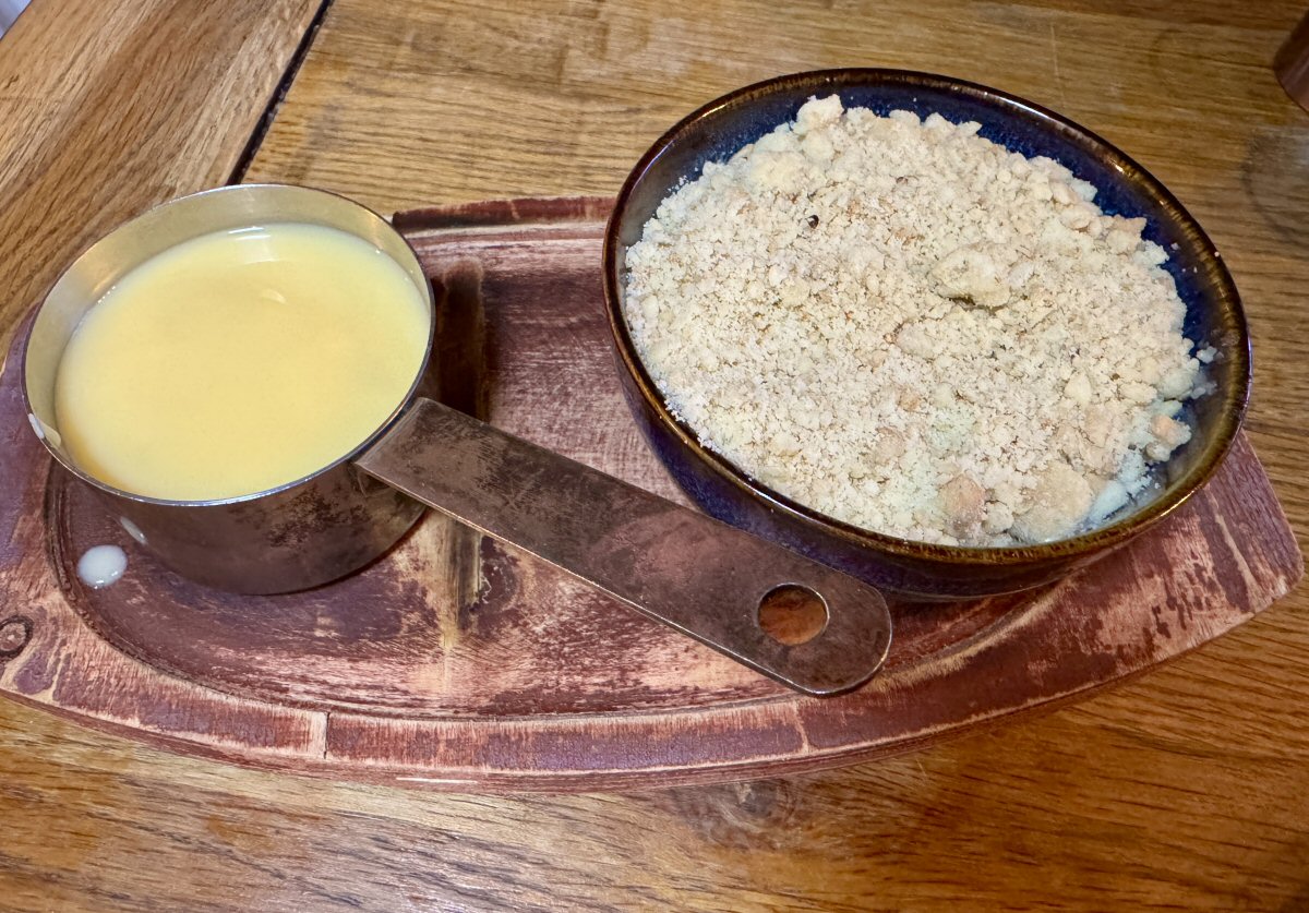 Our final courses were Apple Crumble with Custard (my choice) and Sticky Toffee Pudding with Salted Caramel Ice Cream for The Man. Chunks of unsweetened apple were still gently crunchy and tart, providing a marvellous back-drop for the velvety, buttery crumble to shine against. I loved the texture of the crumble, something akin to coarsely broken up shortbread, and it was just sweet enough to enhance the fruit without being ‘too much’. Being frank, I could take-or-leave the Custard; there was nothing to actively dislike, but there was nothing to recommend it’s bland, non-descript flavour, either.