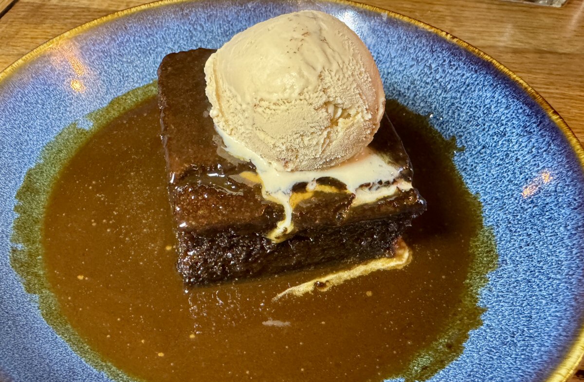 Sticky Toffee Pudding is one of those sweet treats that simply has to be served in a sizeable wedge: anything else is a crime against this iconic pud! Thankfully, Chef at The Congresbury Arms is in this camp, and His Nibs sighed happily when he clapped eyes on the dramatically dark square of it. Tremendously rich in flavour and satisfyingly dense in texture (without being stodgy), this was a total star in the pudding world. Where I’d moaned about the amount of gravy on my main course, Chef’s liberal hand with the Toffee sauce was reaping dividends from His Nibs, who could’ve eaten a lake of the stuff! Mind you, I have to say that it was jolly fine. A sphere of top-quality Salted Caramel Ice Cream was an excellent addition here, adding a contrast of temperature and a silkier, lighter taste in the mouth.