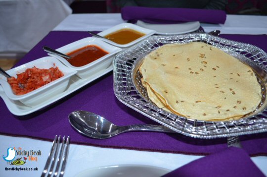 The Chick and I made the Birthday Boy wear his ”badge of honour” on the walk up to the restaurant and into the venue itself, and we took a bottle of Prosecco with us to toast the occasion. Having been shown to our table and given the menus to look at, we settled into our seats ready for a great evening. One of the young men brought out Poppadoms and the pickle tray, so we tucked into the fresh crispy, non-greasy Poppadoms with much gusto.