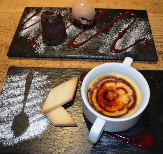 Now, you know how much our little flock likes its food reader, so it will come as no surprise to hear that we were already discussing what to have for dessert as our mains were being cleared away. Anthony came to take our order and my choice was The Dark Chocolate Fondant with Brandy Snap Basket and Milk Chocolate Ice Cream and Hubster plumped for the Vanilla and Raspberry Creme Brulee with Homemade Shortbread Biscuits.