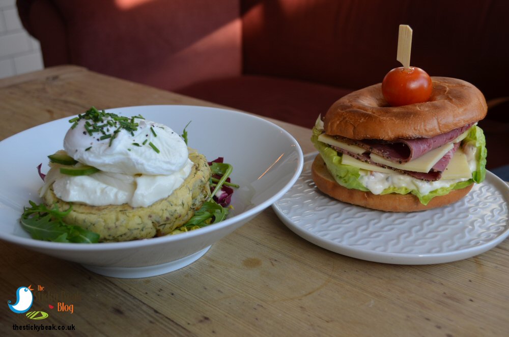 There is a lovely choice of food on offer, as well as a daily specials board, and there were so many dishes I could’ve had; being conscious of the fact that I was having a three course dinner that evening, I opted for the New York Deli Bagel. His Nibs fancied the Swedish Potato Pancake, and we both had a black coffee.